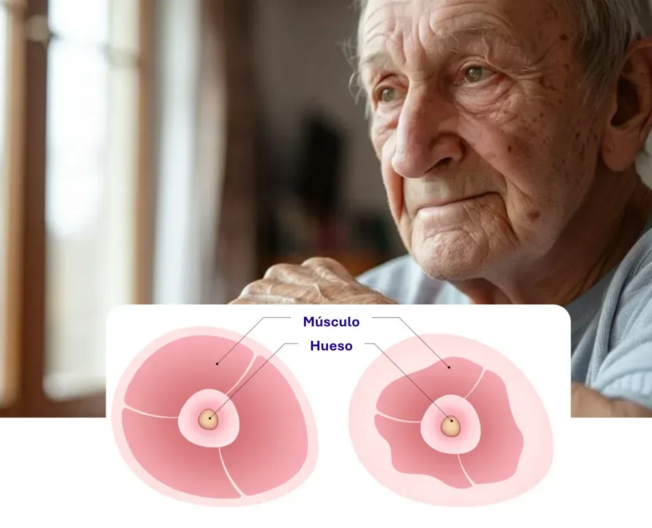 Los síntomas de la sarcopenia varían desde la pérdida de fuerza muscular, la disminución de masa muscular, hasta un aumento en el riesgo de caídas y fracturas, así como la reducción de la movilidad y funcionalidad.